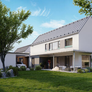 Realistické vizualizace zahrad, fasád, veřejného prostoru a venkovních úprav včetně nočních scén.